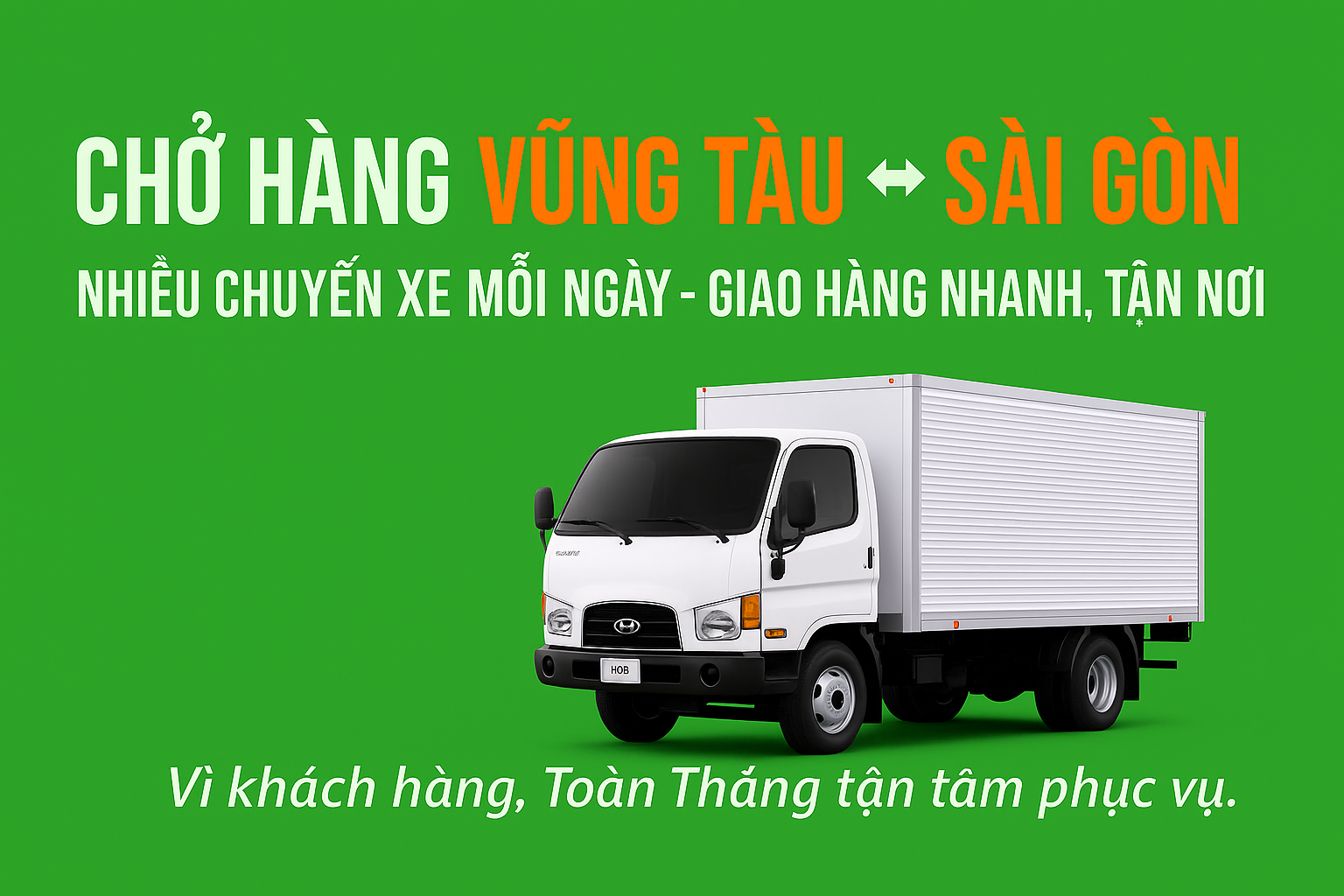Công ty Vận tải Toàn Thắng VT là đơn vị uy tín chuyên vận chuyển hàng hóa, xe máy và chuyển nhà trong ngày giữa Sài Gòn và Vũng Tàu. Với hơn 25 năm hoạt động, Toàn Thắng VT luôn được khách hàng lựa chọn vì tốc độ nhanh, chi phí hợp lý và độ an toàn tuyệt đối.